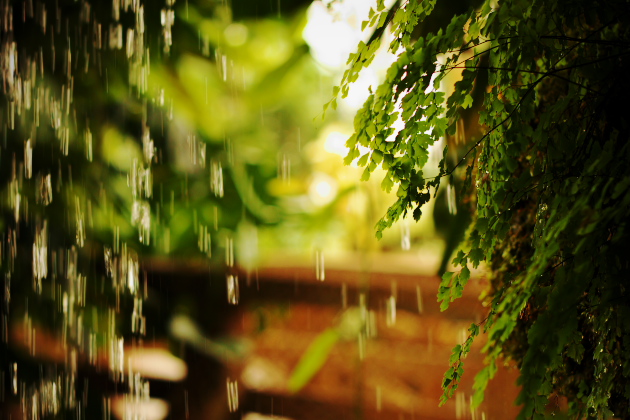 流れる水しぶきに輝く緑